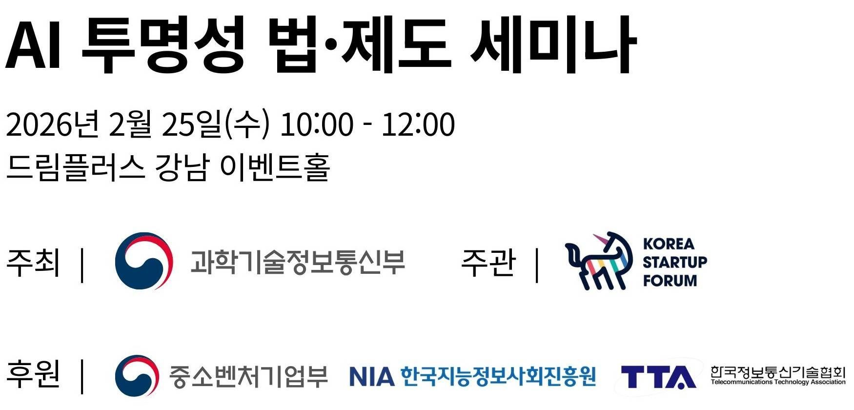 오는 2월 25일(수), 과학기술정보통신부가 주최하고 코리아스타트업포럼이 주관하는 'AI 투명성 법·제도 세미나'가 드림플러스 강남에서 개최됩니다.